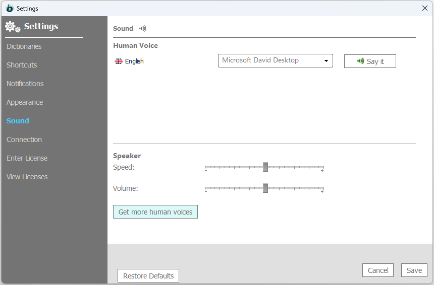 Select the three dots next to the search bar, followed by Settings, and then the Sound tab. Under the Speaker section you can customize the speed and/or volume of speech.